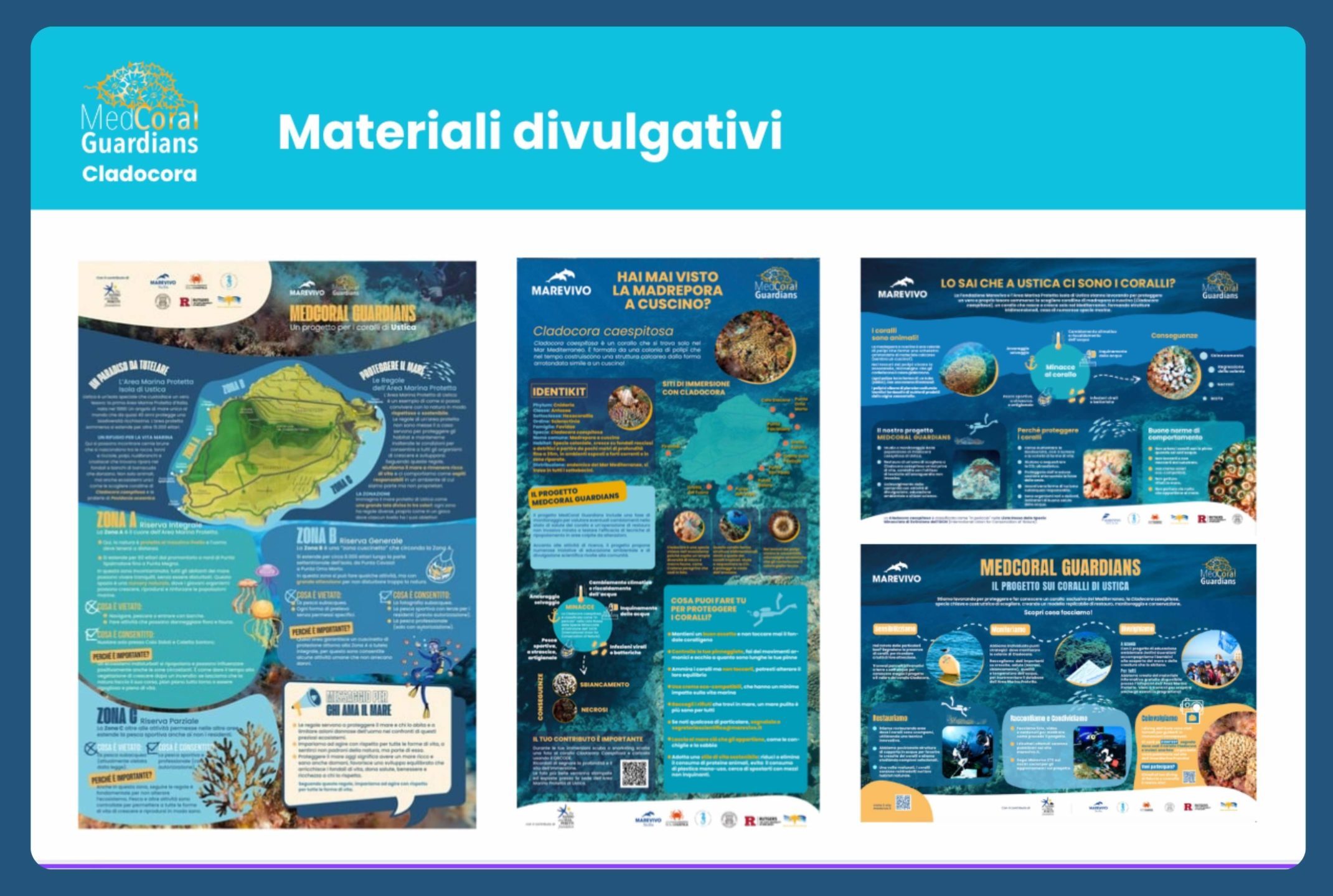 Il progetto prevede la realizzazione di pannelli informativi e materiali didattici rivolti a subacquei e centri diving, studenti e docenti, turisti, cittadini residenti, che illustrano l’importanza della Cladocora e Cystoseira e spiegano le attività previste dal progetto. Inoltre verrà realizzato un percorso dedicato ai subacquei, con tabelle di segnalazione sommerse che offriranno la possibilità di osservare queste due specie nei diversi stati di conservazione.