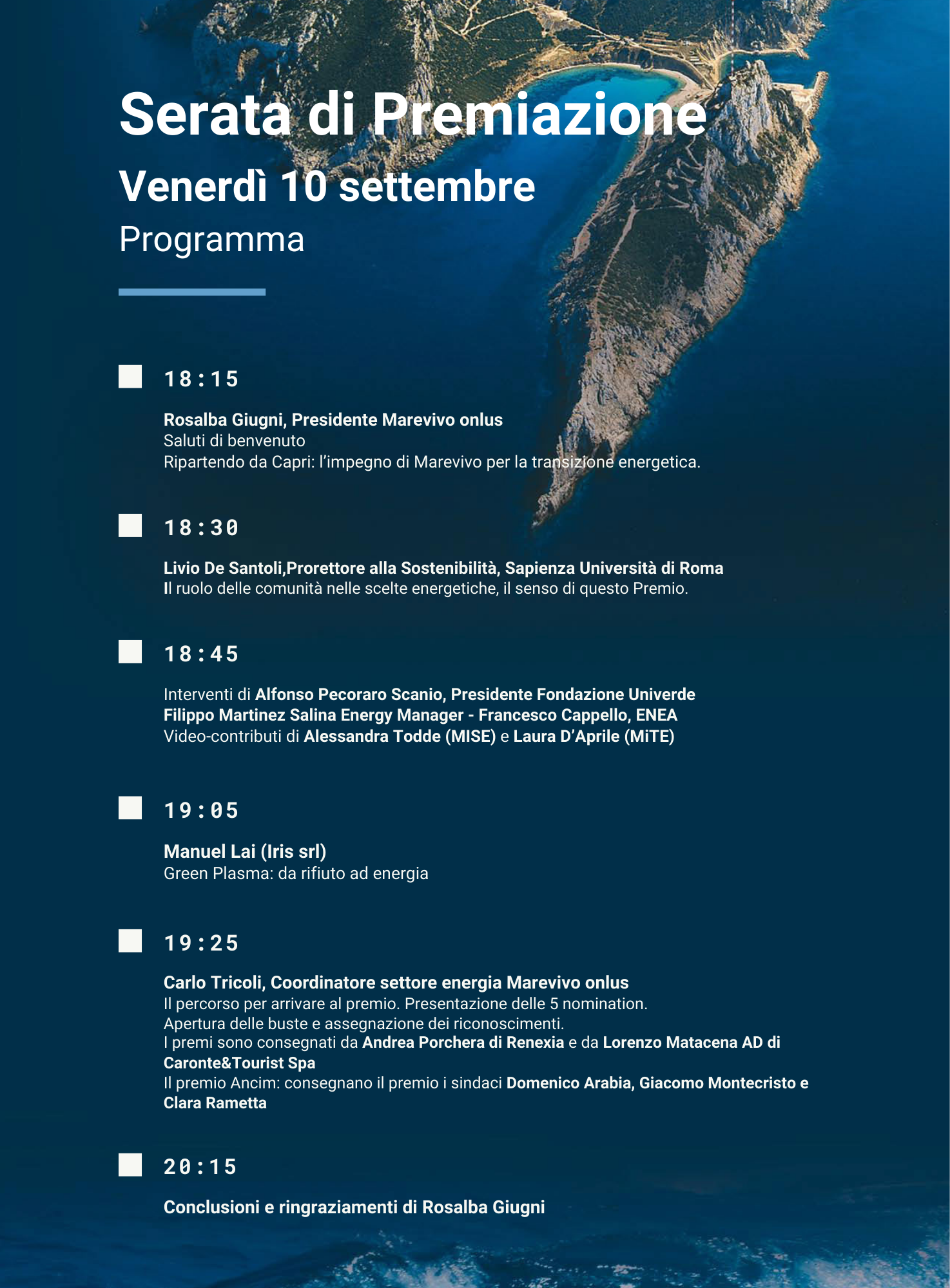 Nella serata del 10 settembre al Teatro Cavea di Punta Megna di Leni si è tenuta la Cerimonia di Premiazione dei progetti internazionali selezionati, in linea con gli obiettivi programmatici della transizione ecologica.