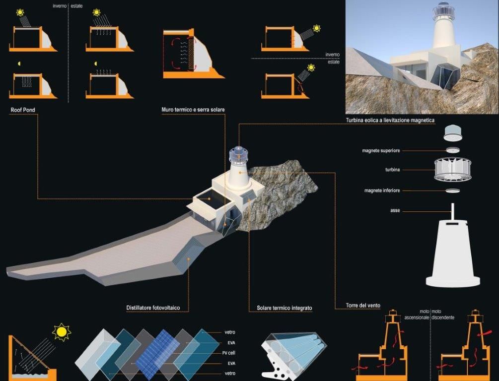 Sistema impiantistico atto a soddisfare i consumi energetici dell’isola di Capraia (LI), che integra diverse fonti rinnovabili, in cui il sole è la fonte predominante, sfruttando la morfologia e le caratteristiche storico-culturali del territorio isolano.