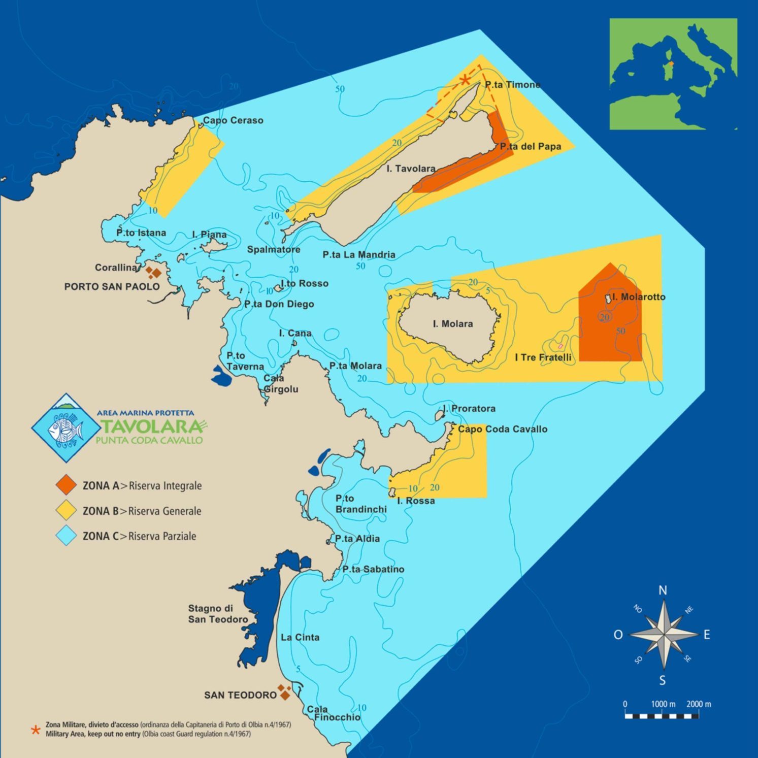 Le attività del progetto si svolgono nelle acque cristalline della Sardegna nord-orientale, in un territorio dominato dall’ Isola di Tavolara. L‘AMP è suddivisa in diverse zone a tutela crescente (Zona A di riserva integrale, Zona B di riserva generale e Zona C di riserva parziale).