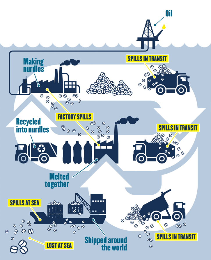 Gli sversamenti accidentali dei granuli di plastica sono molto frequenti e possono avvenire in qualsiasi fase del processo industriale, dalla loro produzione al trasporto fino alla produzione di prodotti in plastica e, ancora, quando di nuovo gli oggetti vengono riciclati in sferule.