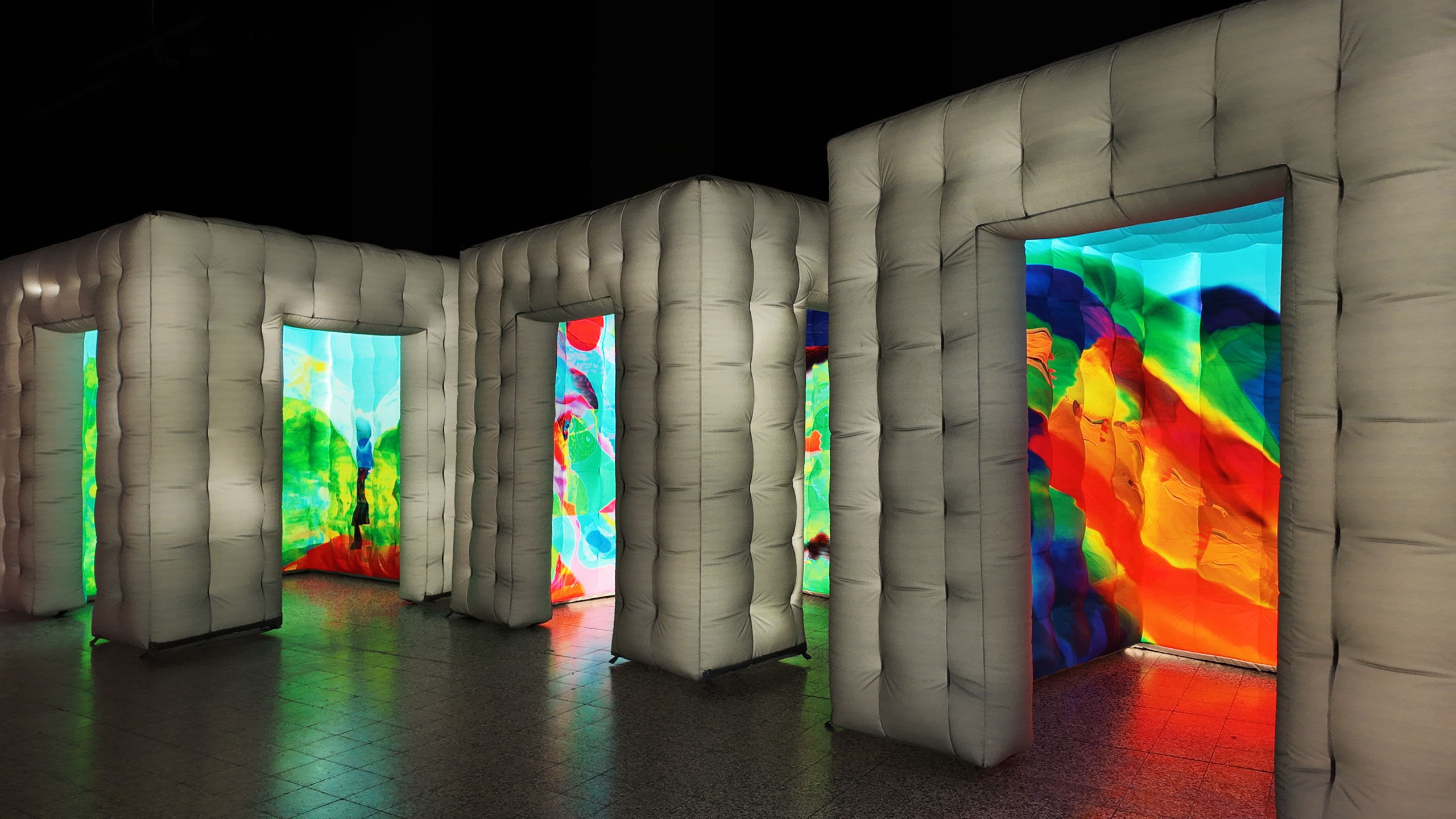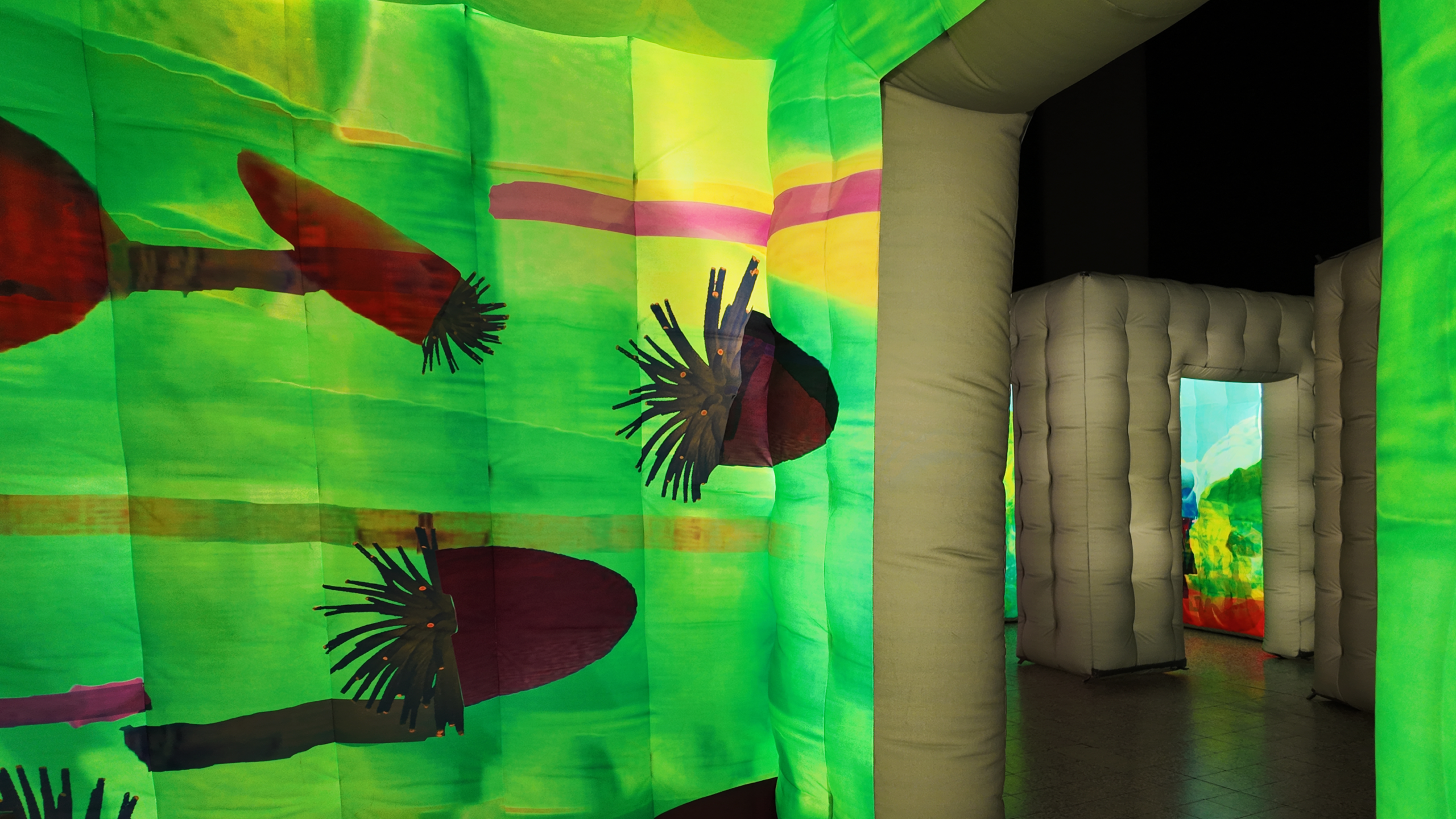 La grande sala espositiva al piano terra del Museo è occupata da una sequenza di piccole stanze luminose e gonfiabili, membrane traslucide che il visitatore attraversa come parti di un unico organismo vivente. Non semplici spazi espositivi, ma ambienti immersivi che evocano fragilità, mutazione e trasformazione, rendendo il pubblico parte attiva dell’opera. Al loro interno prendono forma scene nate dalla ricomposizione di oggetti di plastica dispersi e ridotti in microplastiche: da questi frammenti emergono figure ibride e inquietanti, al tempo stesso seducenti e perturbanti, che rivelano il mondo alterato, e potenzialmente minaccioso, che abbiamo contribuito a creare.