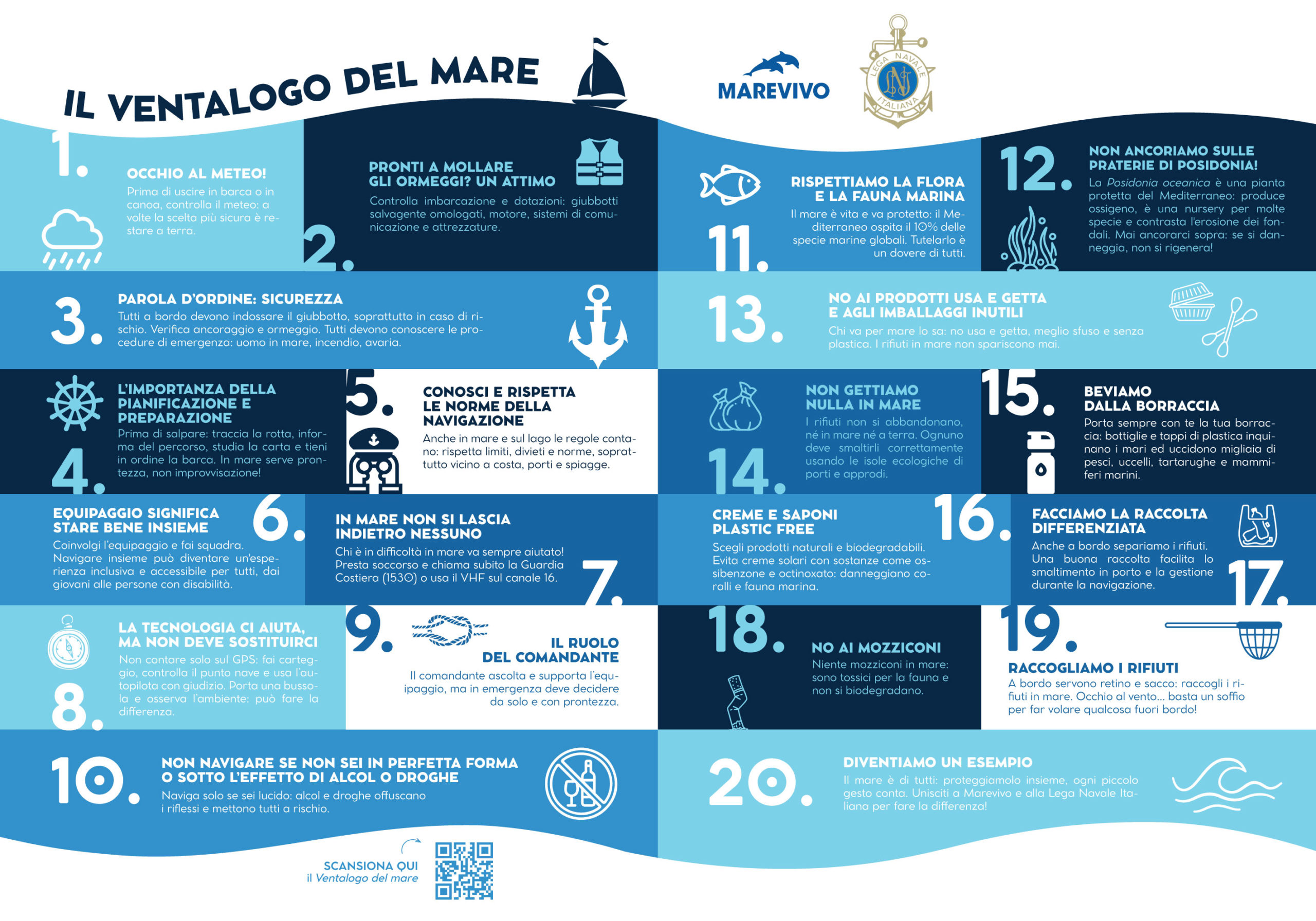 Il “Ventalogo del Mare” descrive venti semplici regole da seguire per prevenire l’inquinamento ambientale e vivere con la giusta consapevolezza e in modo sicuro e inclusivo il diporto e l’attività sportiva in mare e nelle acque interne.