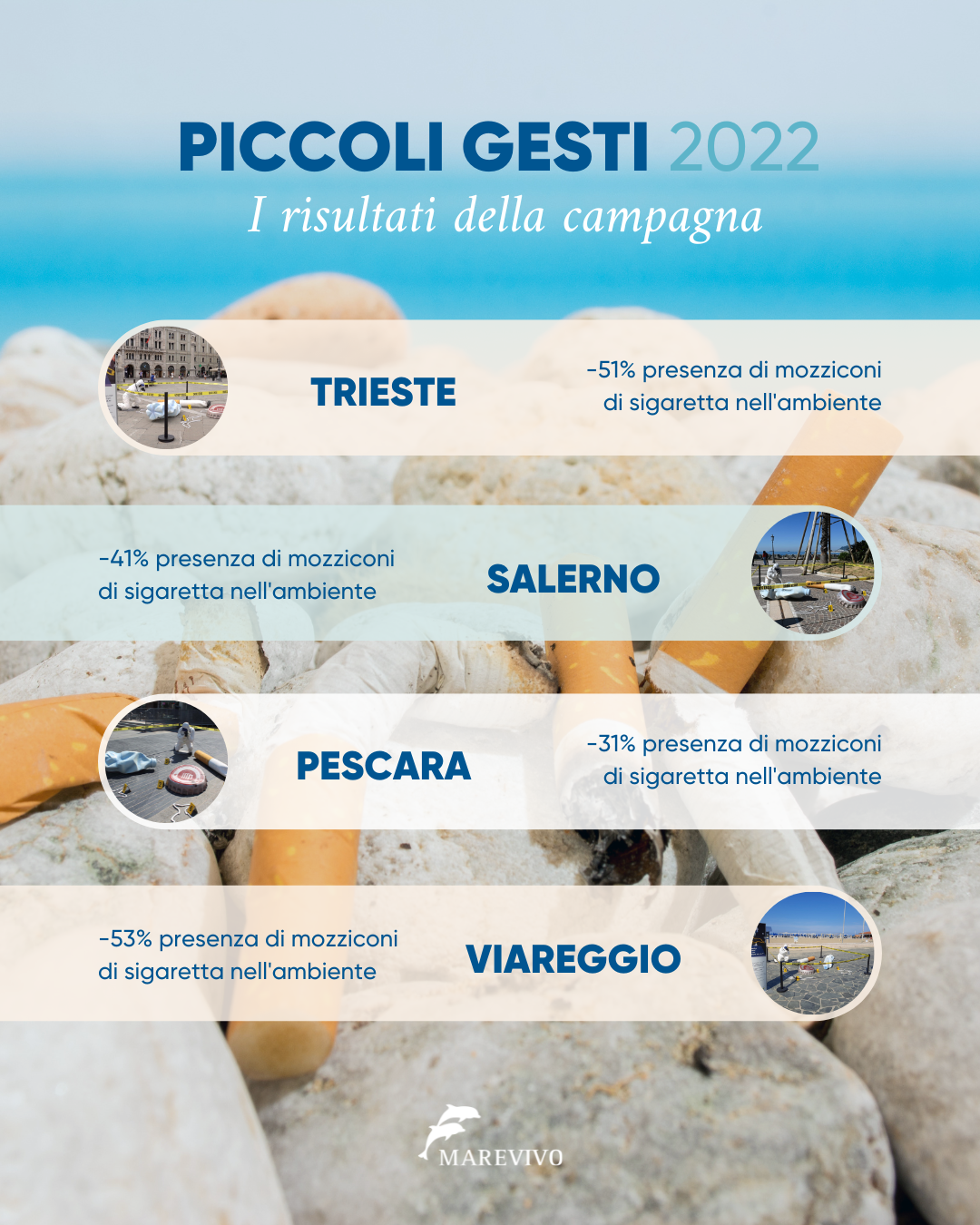 “Siamo giunti al terzo anno della campagna nazionale ‘Piccoli gesti, grandi crimini’, felici di confermare un risultato decisamente significativo relativo alla riduzione del littering nelle città italiane coinvolte. Marevivo, forte della sua esperienza soprattutto nell’ambito delle attività di sensibilizzazione, ha tra i suoi obiettivi la necessità lavorare sulla percezione collettiva del problema. I piccoli gesti come l’abbandono di mozziconi e piccoli rifiuti sono spesso generati da mancanza di conoscenza del grave danno provocato, che rappresenta il punto focale del nostro impegno e l’obiettivo della campagna. Ci auguriamo di poter continuare a parlare ai cittadini, trasmettendo il rispetto e la cura per l’ambiente in cui viviamo. L’augurio è di poterlo fare ancora con il lavoro sinergico di Istituzioni, Imprese e Terzo settore” ha dichiarato Raffaella Giugni, Responsabile Relazioni Istituzionali Marevivo.