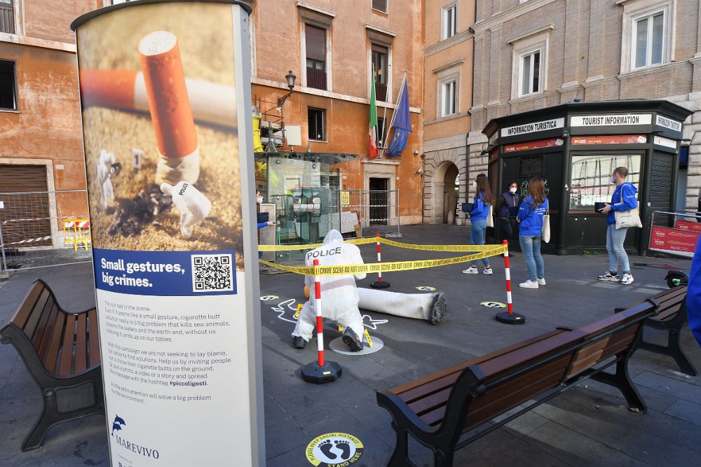 Contestualmente, sono stati organizzati degli interventi ad alto impatto visivo tra cui una campagna advertising e l’installazione di una vera e propria «scena del crimine» in cui, accanto alle vittime – raffigurate da sagome di pesci, tartarughe e stelle marine – è stata posta la riproduzione di un mozzicone gigante, simbolica arma del delitto. La «scena del crimine» ha suscitato oggi la curiosità di diversi passanti che si sono fermati ad osservare l’insolito spettacolo presso Piazza delle Cinque Lune a Roma, a pochi passi dal Senato.