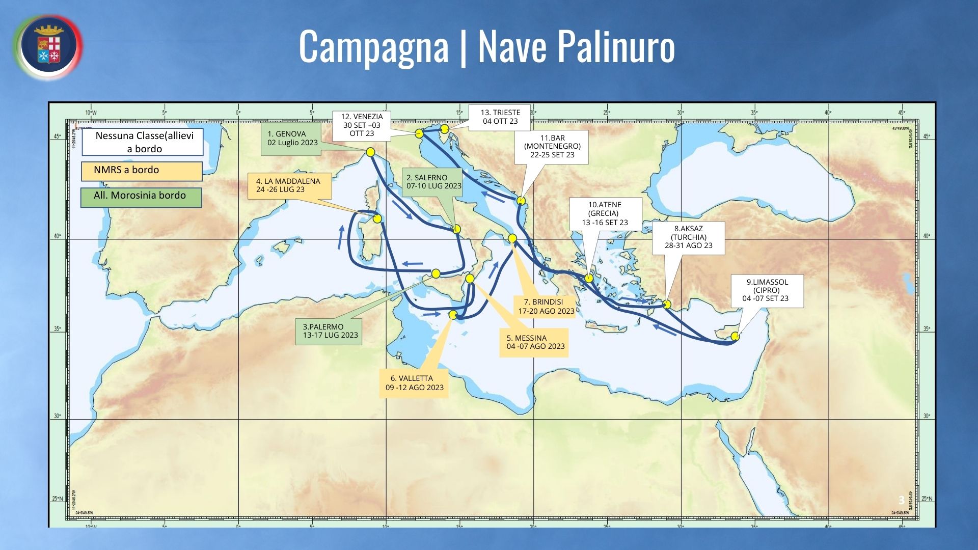 The campaign – designed to raise people’s awareness on the need to implement a true ecological transition – started out with preliminary meetings in the prestigious schools of the Italian Navy, to involve all the equipment and the students who will be onboard the ships, and will continue with events in some of the ports where the ships will stop and with a travelling exhibition onboard the Palinuro and Vespucci school ship.
