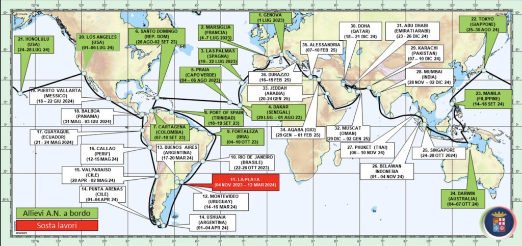 The extraordinary journey around the world of the Vespucci training Ship will last 20 months. The ship will stop in more than 30 ports, over the continents, and the exhibition will always be open to visitors.