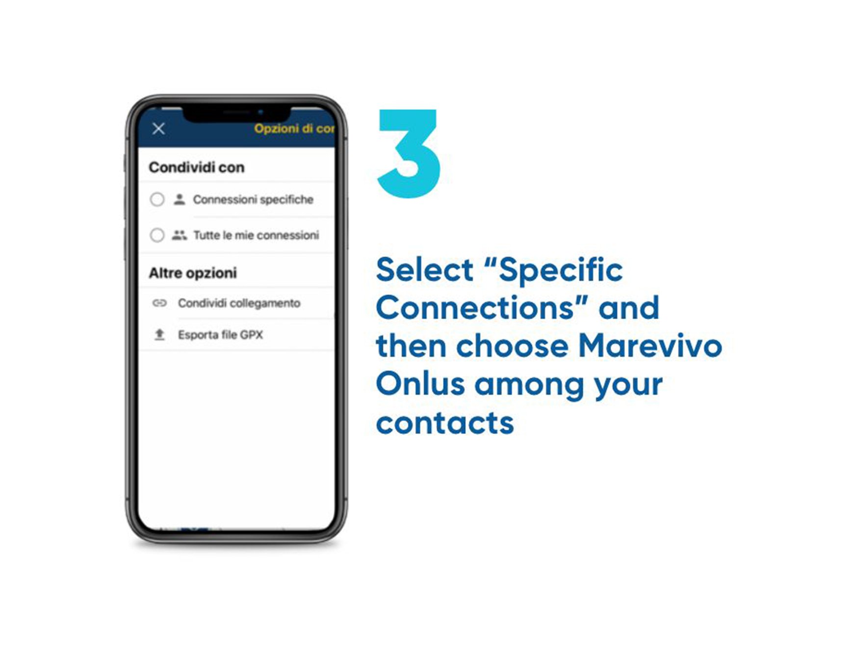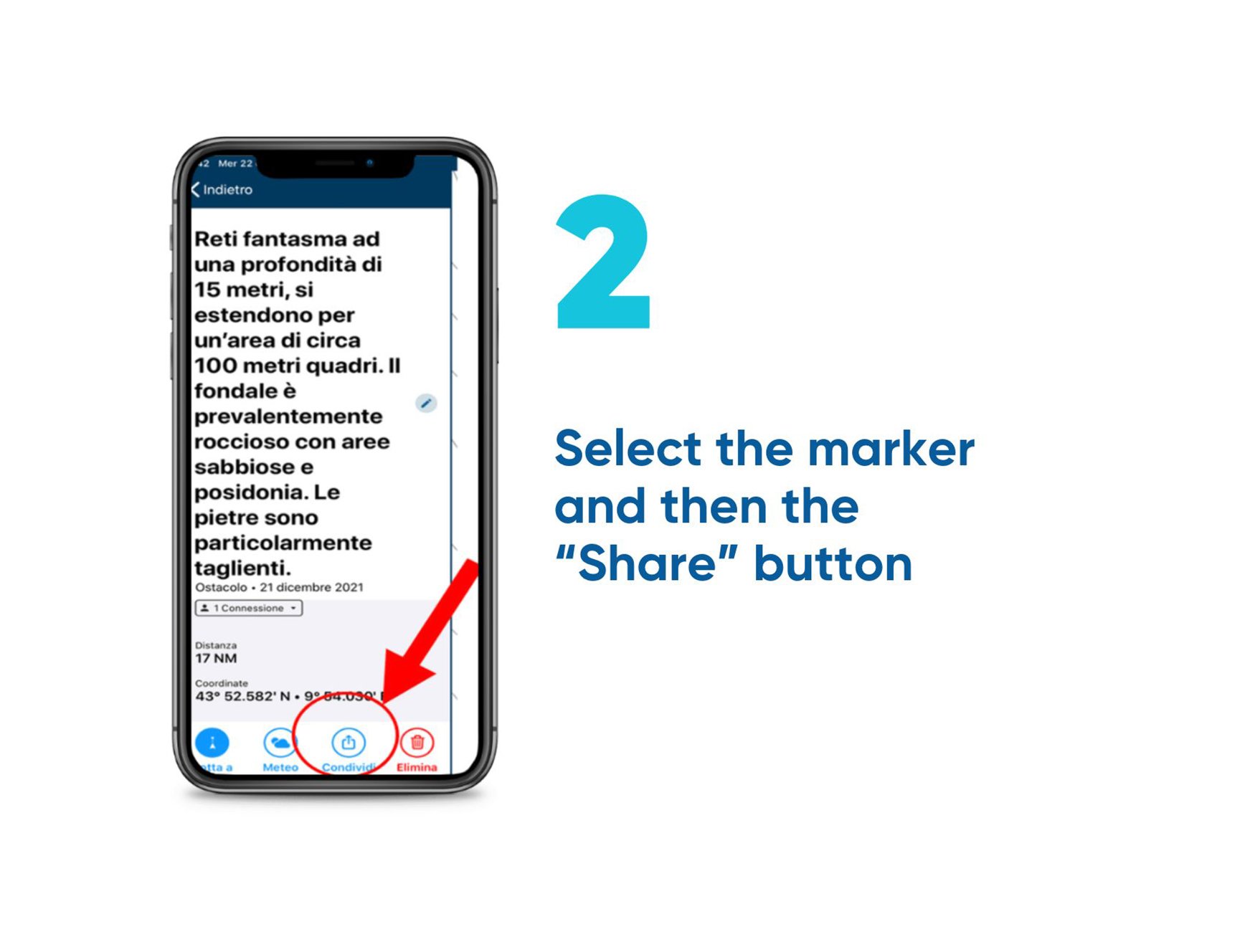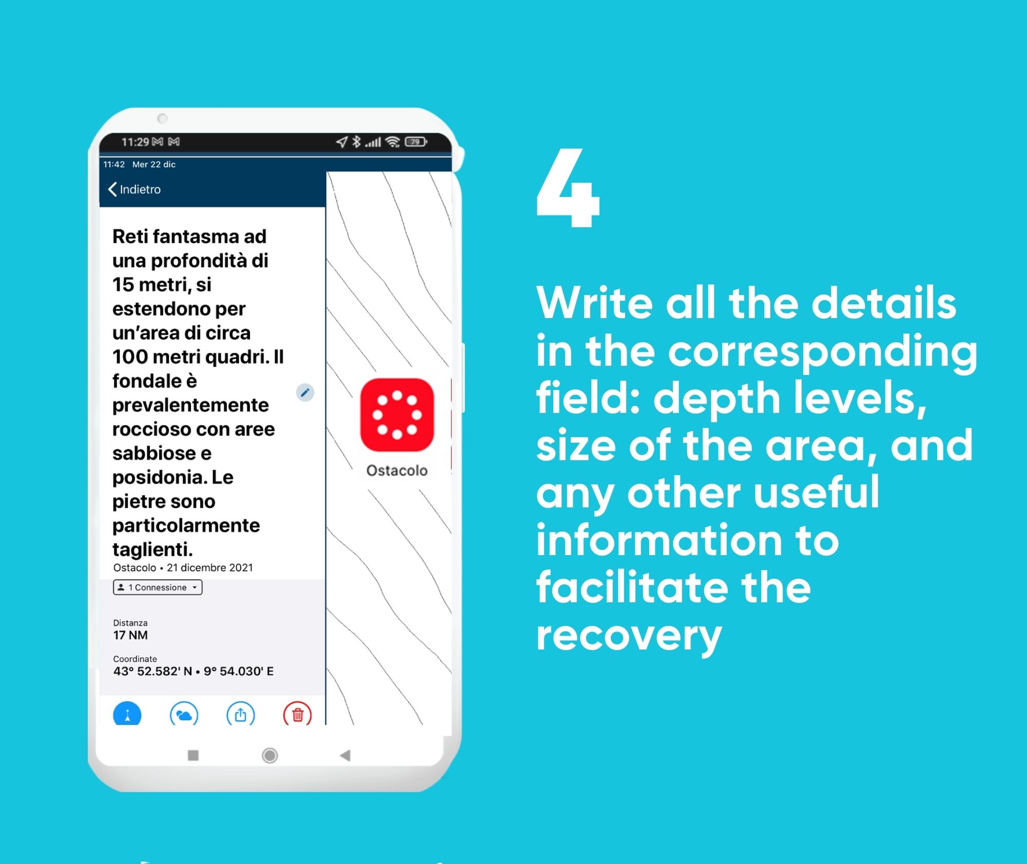 Through the “Connections” feature, it is possible to report to Marevivo the location and type of waste detected on the seabeds. The procedure is simple: download the app, create a marker with the coordinates of your position and share it with the Association’s account through the specific feature.