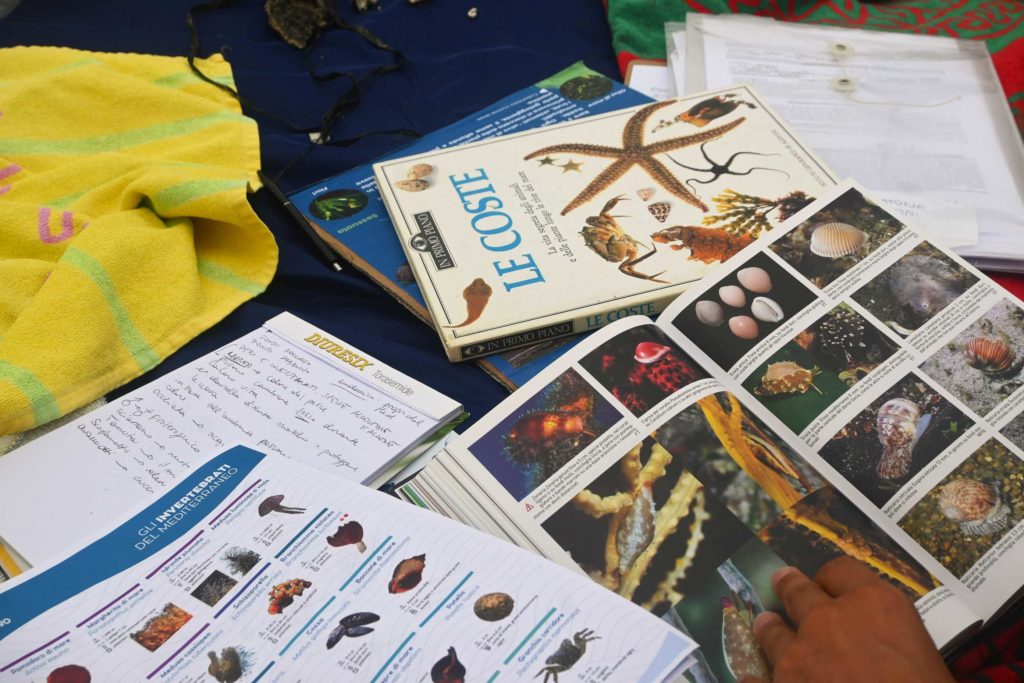 Niente dispositivi digitali, ma solo strumenti analogici: libri illustrati sulla flora e fauna del Mediterraneo, fotografie naturalistiche e schede scientifiche descrittive delle specie vegetali e animali che popolano il litorale. Ogni specie è stata analizzata sotto tre aspetti:
